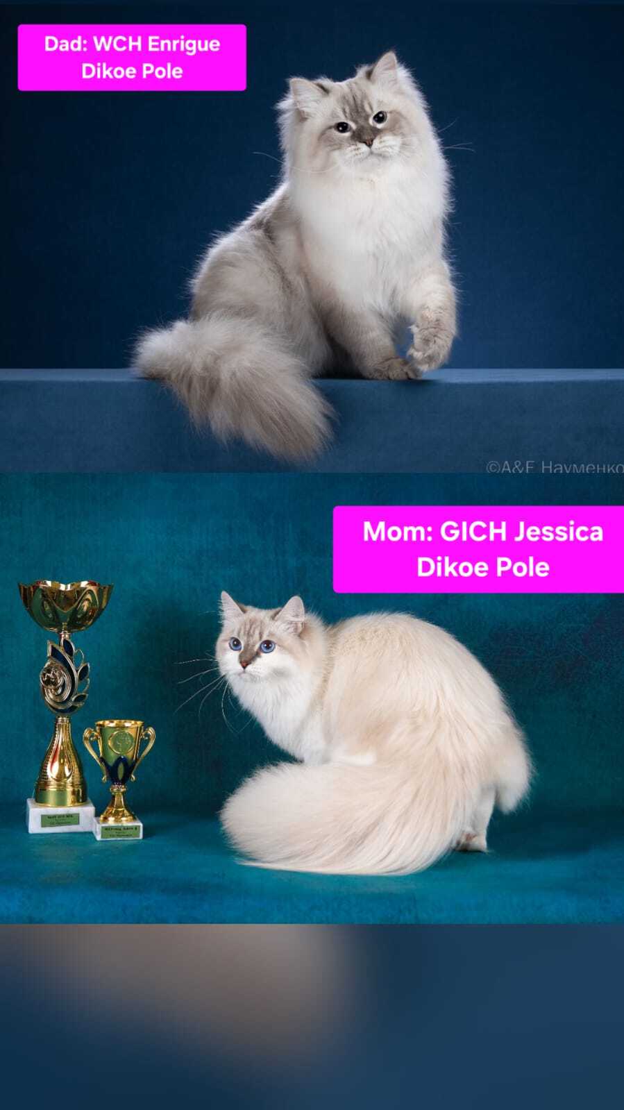 Don Batyushka Dikoe Pole, male SIB, a 032133 (блю табби поинт с белым) Russia, Volgograd father: WCH Enrique Dikoe Pole (SIB a 21 33) mother: GICH Jessica Dikoe Pole SIB (а 03 2133) Born 09.05.2025 excellent WCF / pedigree - Russia All tests parents