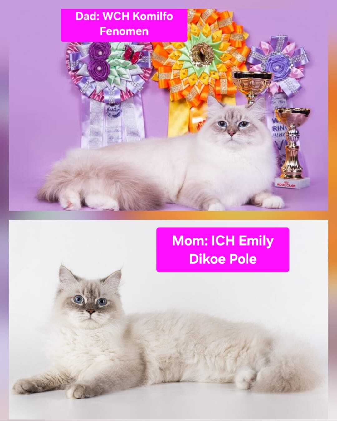 Born: 29.03.2025 SIB a 092133, female Dad: World Champion Fenomen Komilfo (SIB аs 092133) Mom: Grand International Champion Emily Dikoe Pole (SIB a 092133) excellent WCF / pedigree - Russia All tests parents